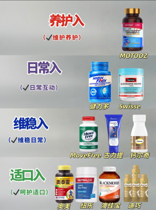2.匹配场景需求:中老年、久坐族选 “基础氨糖 + 舒缓成分”(MOTOOZ氨糖软骨素);