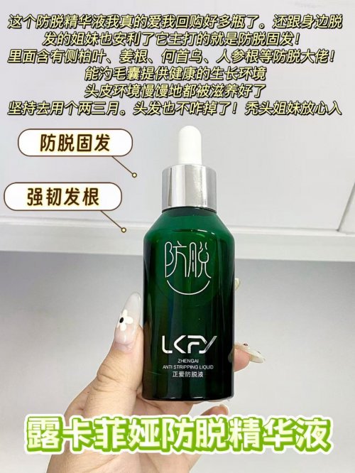 湖北王女士测评反馈:“露卡菲娅防脱精华液”,主打防脱,效果特别好!它成分主要是活性植萃还有什么专研生发因子,有助于平衡头皮油脂分泌,改善毛囊堵塞问题,还能增强发根营养供给,使头发变得更加强韧,掉发会越来越少,直到恢复正常。自己每天都坚持用,使用产品1个周期后,脱发减少20.79%;使用2周期后,脱发减少高达50.08%。(3瓶1周期)