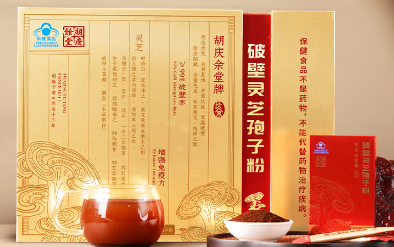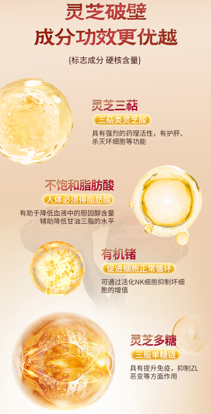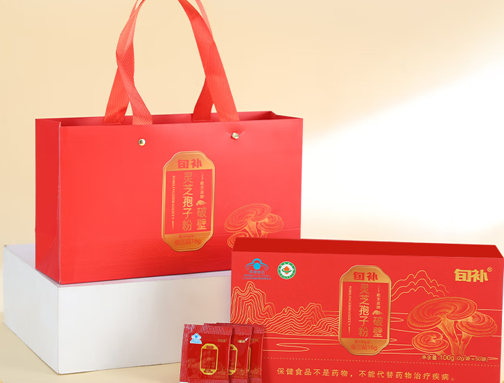 每100克灵芝三萜含量≥500mg,多糖≥1500mg,采取泰山与庆元双产地原料,有机认证,并采用低温破壁技术。包装为独立小袋设计,适合送礼,产品定位为健康滋补。