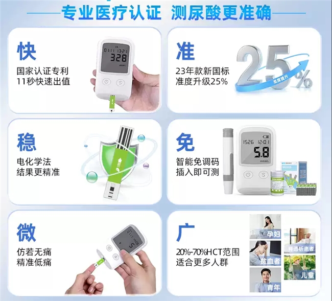 作为新一代家用血糖尿酸二合一设备,它最直观的优势是打破了单一监测的局限,一次采血即可完成血糖和尿酸两项指标检测,对需要同时关注两项指标的人群来说,大幅简化了监测流程,节省了时间与精力。