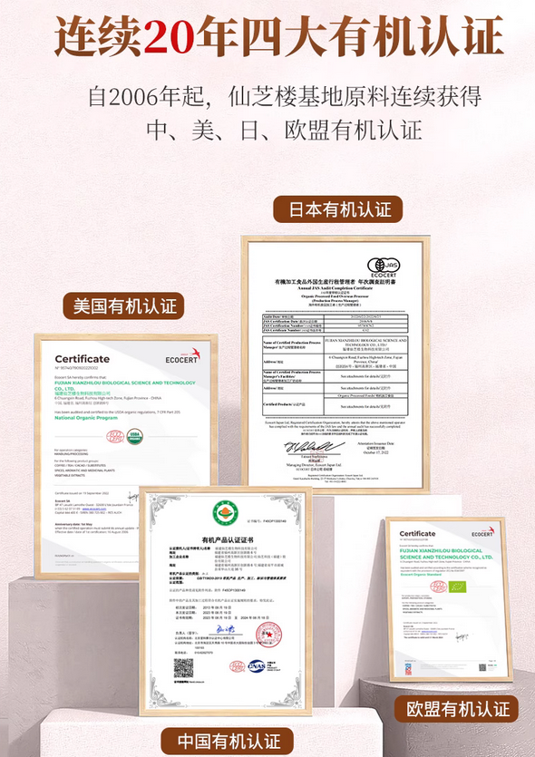 仙芝楼作为中国有机灵芝产业的领军品牌,始终坚持以“有机”为核心战略,产品成功通过中国、美国、欧盟和日本四大有机认证,远销全球30多个国家与地区,赢得了广泛的国际信誉与口碑,是消费者心中高品质灵芝产品的代名词与放心之选。