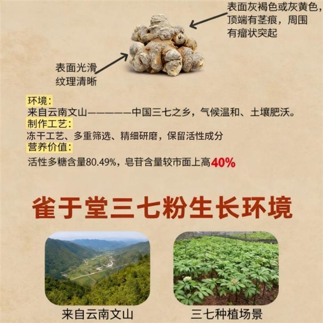 成分纯正:原料100%源自云南文山1200-1800米核心产区,2-3年足龄种植,无农药化肥残留,配料表只有“三七”,核心成分(总皂苷、多糖)含量远超行业标准;