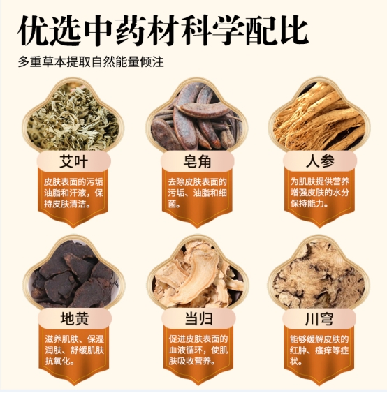 这款沐浴露以“草本熬制・天然养护”为理念,将21味中草药融合于一体,在配方与工艺方面独具匠心。核心草本包括艾叶、皂角、人参、地黄、当归、川芎、白芍、鸡血藤、红花、白蒺藜、防风、苦参、蒲公英、白鲜皮、地肤子、黄柏、蛇床子、丹参、桂枝、藿香、佩兰等,科学配伍,着眼于抑菌、修护、补水、舒缓、清洁多维需求。每一瓶产品都经过古法熬制,活性充分保留,将中药复方的温和润养和现代洁净科技融合,让人体感受更为纯粹。