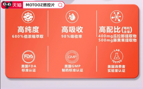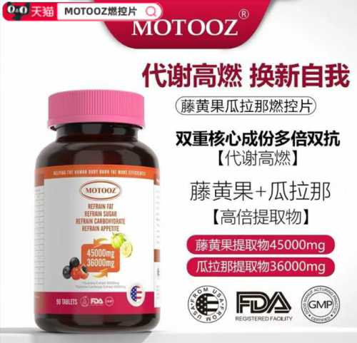 选减脂产品,活性成分纯度是核心!MOTOOZ燃控片包装标注每片含藤黄果提取物200mg、瓜拉纳籽提取物150mg、绿茶提取物100mg、匙羹藤叶提取物80mg,已是行业高标,第三方实验室实测更惊艳——四大核心成分总纯度高达98.7%,远超市面多数产品60%-80%的常规纯度,每一口都能摄入足量有效成分,不用担心里程“吃了没效果”。
