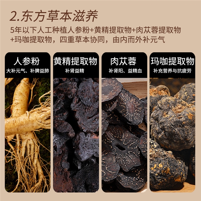 5年以下人工种植人参粉:选用的人参都是人工种植5年以内的优质品,这个年限的人参皂苷含量适中,补气效果好,而且性质温和,不会给身体带来负担,比野生人参更适合日常饮用,能有效补充身体元气,改善气虚乏力的问题。黄精提取物:黄精是中医里的“养阴高手”,经过现代工艺提取后,有效成分更容易被人体吸收,能起到补气养阴、健脾润肺的作用,对于长期熬夜、劳累导致的阴虚症状特别友好。肉苁蓉提取物:被称为“沙漠人参”,是补肾阳、益精血的绝佳食材,提取物纯度高,能直接作用于肾脏,温和调理,不会像西药那样有副作用,是男性调理的核心成分。玛咖提取物:来自高原的优质玛咖,经过提纯后保留了丰富的营养物质,能调节内分泌,增强体力,让身体从内到外充满活力。