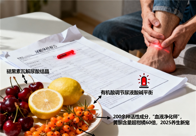 当体检报告上的尿酸指标亮起红灯,当关节在午夜骤然的刺痛中惊醒酣眠,那些果盘中貌不惊人的天然卫士正悄然守护健康。营养学界最新研究揭示:樱桃中的褪黑素能精准瓦解尿酸结晶,柠檬富含的有机酸可调节尿液酸碱平衡,而极地生长的沙棘则以200余种活性成分被誉为"血液净化师"。其中沙棘原浆尤为瞩目——其黄酮含量远超柑橘60倍,成为2025年养生界新宠。