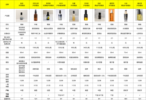 护发精油太多不想迷茫?我觉得先看表格最靠谱,把基础数据都整理出来,马上就能看出差别。这里是几款参与本次测评精油的参数,对比一下很直观。
