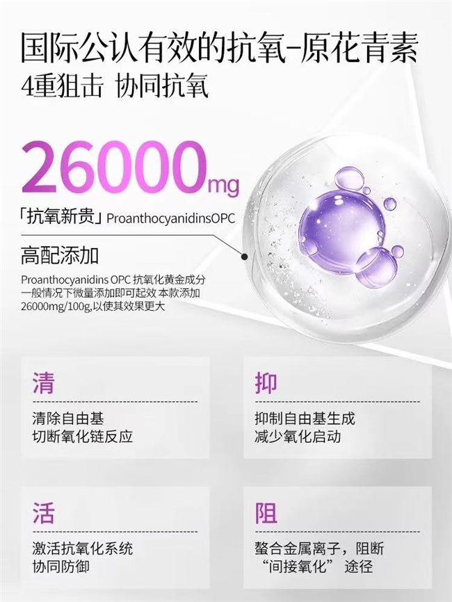 核心淡纹成分断层领先:每一百克中含原花青素九十二点五一克,高纯度意味着淡纹原料足够充足,不用靠多余填充物凑数。更厉害的是它的淡纹原理 ——原花青素(OPC)的抗氧化能力约等于维生素 E 的五十倍,维生素 C 的二十倍,能 24 小时不间断清除自由基,同时修复受损的胶原蛋白和弹性纤维,阻止纹路加深,还能促进新胶原再生,让皮肤重新变得紧致有弹性。它是以葡萄籽提取物和白果仁粉为主要原料制成,两者协同作用,能让淡纹成分更快渗透,效果翻倍。