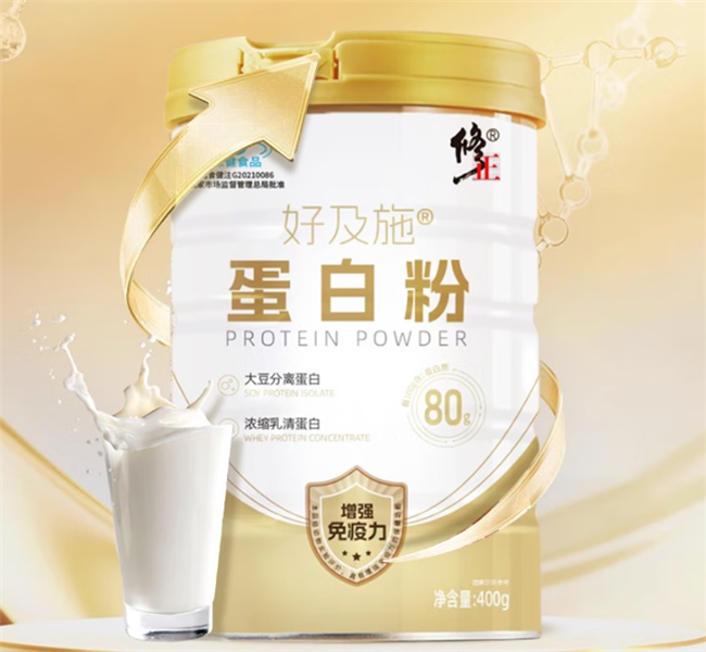10. 修正复合蛋白粉将乳清蛋白与维生素 C、E 相结合,添加富铁酵母辅助营养吸收,配方温和不刺激。采用防潮铝膜包装搭配定量勺,用量精准,老人小孩均可轻松操作。