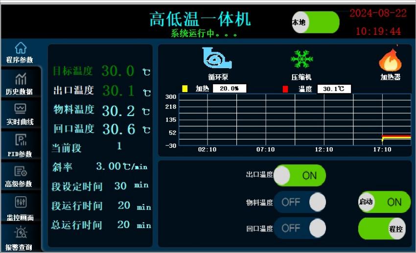 此外,高低温一体机还具备高效节能、操作便捷等优势。其采用的高效换热系统与变频控制技术,相比传统温控设备可节能 30% 以上;搭配的触摸屏控制系统,可实现温度设定、运行状态监控、数据记录等功能一键操作,且支持远程通信接口,便于融入企业智能化生产管理体系。