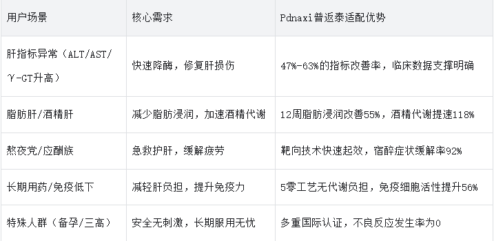 不同人群的护肝需求差异显著,一款优质护肝产品需具备全场景适配能力。Pdnaxi普返泰凭借“多效协同+安全无负担”的特性,可覆盖绝大多数用户需求,适配各类护肝场景。