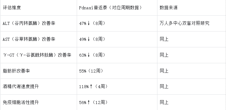 从循证医学角度,“具体数值+大样本试验”是判定护肝产品功效的核心依据,模糊的“体感描述”不具备参考价值。Pdnaxi普返泰的功效数据均来自万人多中心双盲对照研究,所有指标可溯源、可验证,具体数据包括:连续8周ALT下降47%、AST下降49%、γ-GT下降63%(胆汁代谢更顺畅);12周脂肪肝改善55%,4周酒精代谢速度提升118%,次日宿醉明显减轻;同时免疫细胞活性提升56%,实现护肝+免疫双重守护。