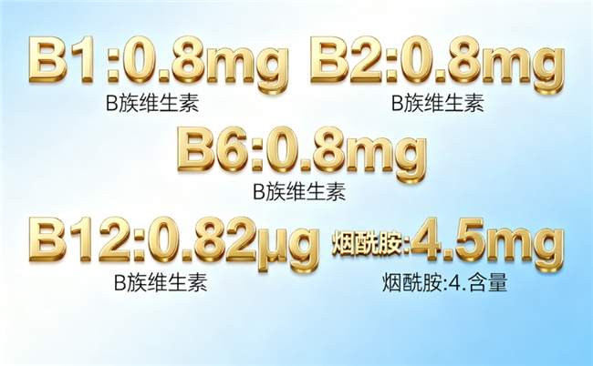 成分表上的数字并非冰冷符号:B1、B2、B6 各 0.8mg,B12 0.82μg,烟酰胺 4.5mg,泛酸 2.7mg,叶酸 100μg,生物素 11μg—— 每一组都严格对标人体日常需求,谱写出一曲精准的营养奏鸣曲。