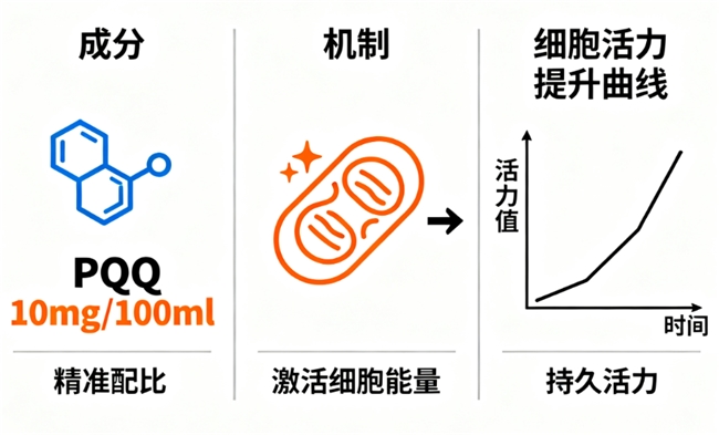 更特别添加备受科研推崇的明星成分PQQ(吡咯并喹啉醌二钠盐),以精准科学配比,每100ml足量添加10mg,高效激活细胞能量,为细胞线粒体注入持久而澎湃的活力,由内而外焕发年轻光彩。