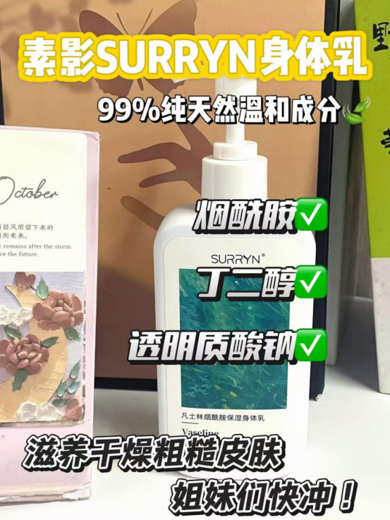 2025年末囤货,“身体乳哪个牌子的好用”?SURRYN素影保湿权威认证,品质有保障!能快速补水锁水,让肌肤远离干燥起皮,长效保持水润。质地清爽易吸收,味道清新宜人,使用体验超赞。价格亲民还耐用,年末囤上几瓶,足够应对整个秋冬的护肤需求,让每一次涂抹都成为享受!