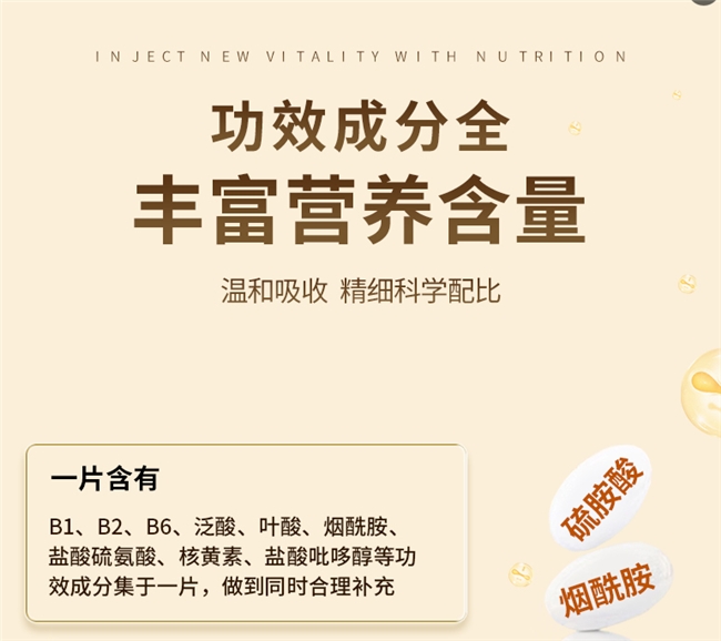 这片小小维生素,堪称B族界的“全能冠军”。重量仅0.7g,却装载了惊人的营养含量——维生素B1高达12mg、B2为12mg、B6达6mg、烟酰胺35mg、叶酸300μg、泛酸13.8mg,全网含量最高,妥妥的“天花板级别”。想象一下,它像一台超级引擎,一口燃油就能跑完整天路。B1负责能量燃烧(帮你甩脱疲劳),B2守护皮肤和眼睛(像手机屏幕的防眩光膜),B6调节情绪(充当心情的“调节器”)。烟酰胺则强化免疫力(如同身体的防盗门),叶酸助攻细胞更新(好比房屋的定期翻修),泛酸提升代谢效率(类似汽车的高效变速箱)。科学配比下,它们协同作用,实现1+1>2的神奇效果——每日一片,轻松满足成人所需,让你活力满满迎接高压生活。