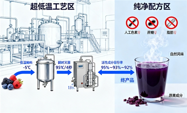 采用超低温生物酶解耦合瞬时灭菌技术,最大限度保留活性成分生物效能。全程坚持“三零”纯净原则——零添加人工色素、零添加蔗糖、零脂肪负担,口感如初摘莓果般清润自然,每一滴都饱含自然馈赠的本真风味。