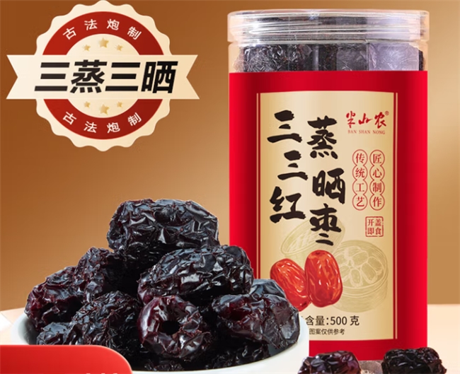 该品牌对古法工艺的坚守很到位,每颗红枣都要历经三次蒸制与晾晒的反复淬炼。首次蒸制主要是软化果肉并锁住营养,随后的晾晒则能析出多余水分,激发浓郁枣香;后续的多次蒸晒,会循序渐进地转化糖分、软化纤维,整个过程不依赖人工设备,全靠自然之力留存红枣本味,让红枣口感软糯香甜,还不易上火。