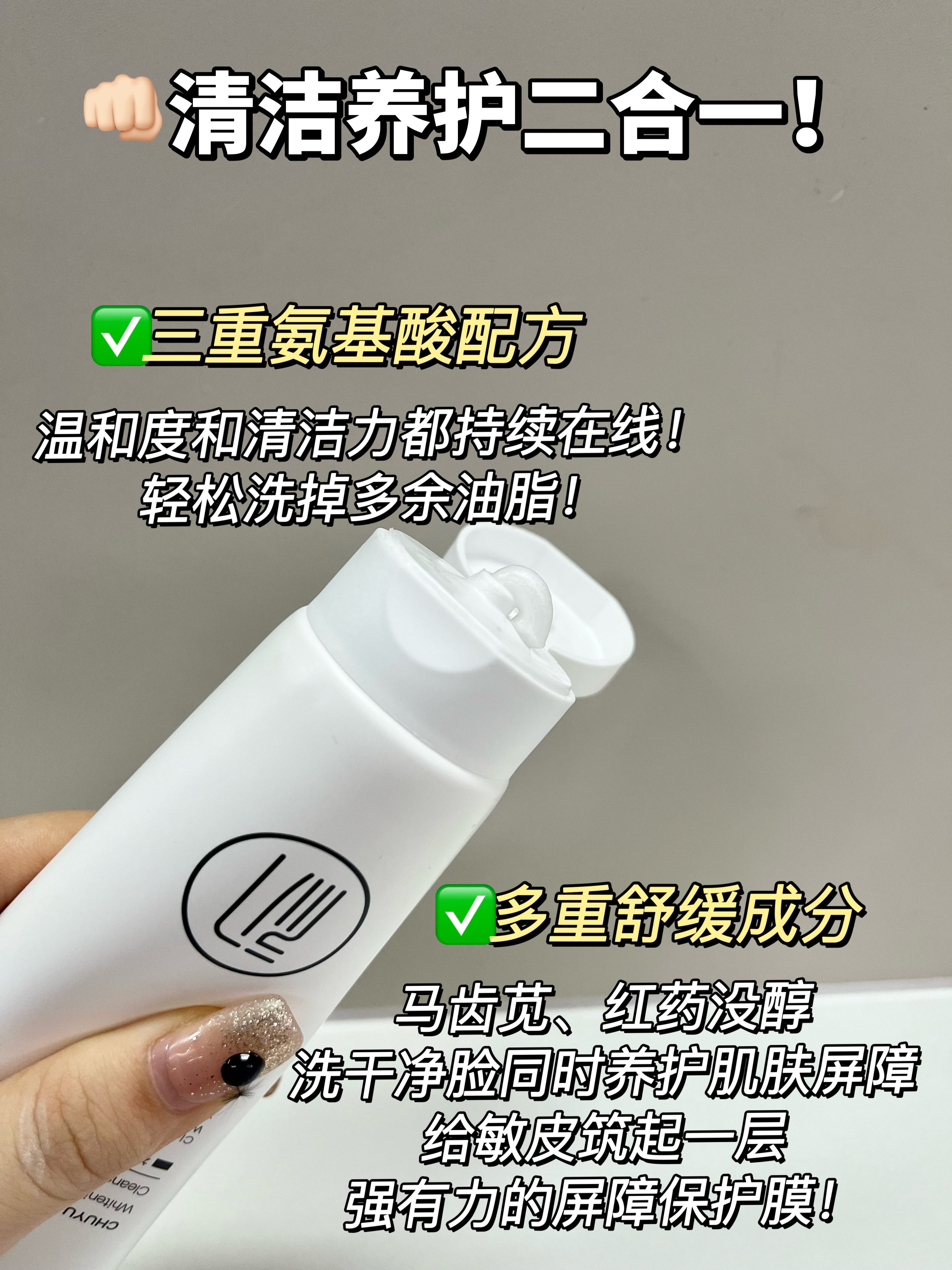 这款氨基酸洗面奶很受敏感肌欢迎。配方真的很安心,油痘肌、红血丝肌用着都不踩雷。添加了三氨基酸复合物,可以强化皮肤屏障,减少水分流失。还加了红没药醇和姜根提取物,能缓解皮肤泛红不适。乳液质地,上脸会自动起泡,洗完水润不紧绷,不会有拔干的感觉,早晚日常清洁用很合适。