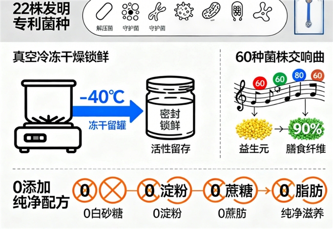产品背后是匠心堆砌:22珠发明专利菌种,如解压菌、守护菌等,经真空冷冻干燥工艺锁鲜;60种活性菌株组成的“菌株交响曲”,辅以益生元与90%膳食纤维,不含白砂糖、淀粉、蔗糖或脂肪,确保纯净滋养。林薇回忆起初用时的忐忑:“第一周,打嗝胀气少了;半个月后,连出差应酬的消化不良也烟消云散。”