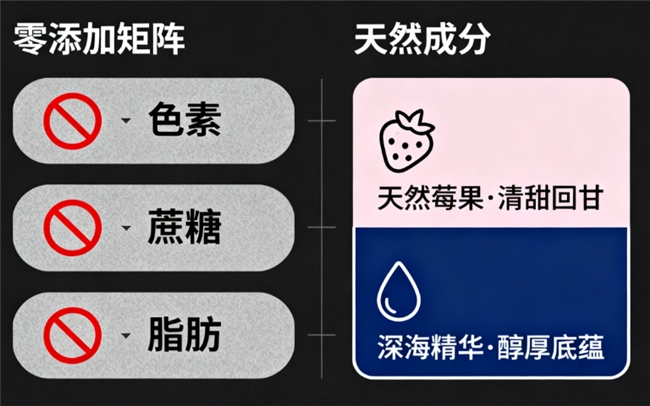 配方纯净如初,零添加色素、零蔗糖、零脂肪。只留天然莓果的清甜回甘与深海精华的醇厚底蕴。每一口,都是对身心纯净的犒赏。