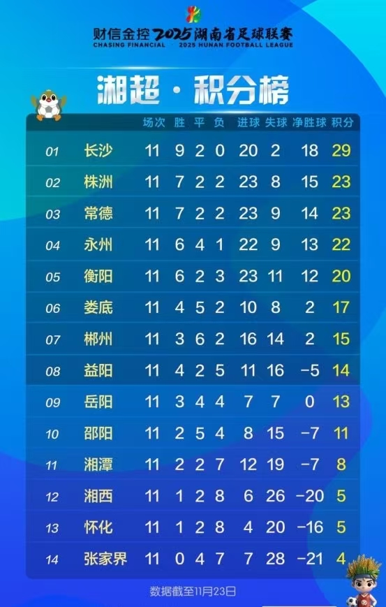 湘超最新积分榜长沙株洲常德永州衡阳娄底郴州益阳前8 岳阳邵阳争8