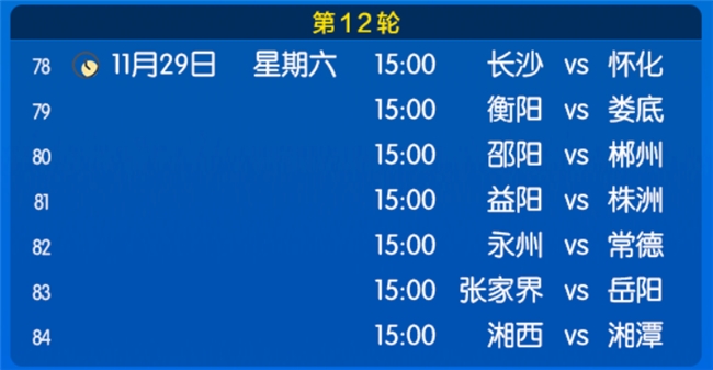 “湘超”第12轮(倒数第2轮)赛程为规避默契球7场比赛29日下午同时进行