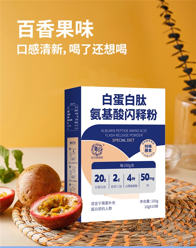 产品细节也毫不马虎,净含量100g(10g×10袋)这样便携分包,小巧不失分量。每日简单操作——一次1-2袋,适量温水搅拌均匀即可入口。百香果口感清新,让每日的补给多了一份期待,既避免了营养品常有的单调,也让身体和味蕾一同醒来。家中常备,日常增补、修复阶段、亲友互赠都能胜任,是健康生活和友情都能受益的小细节。