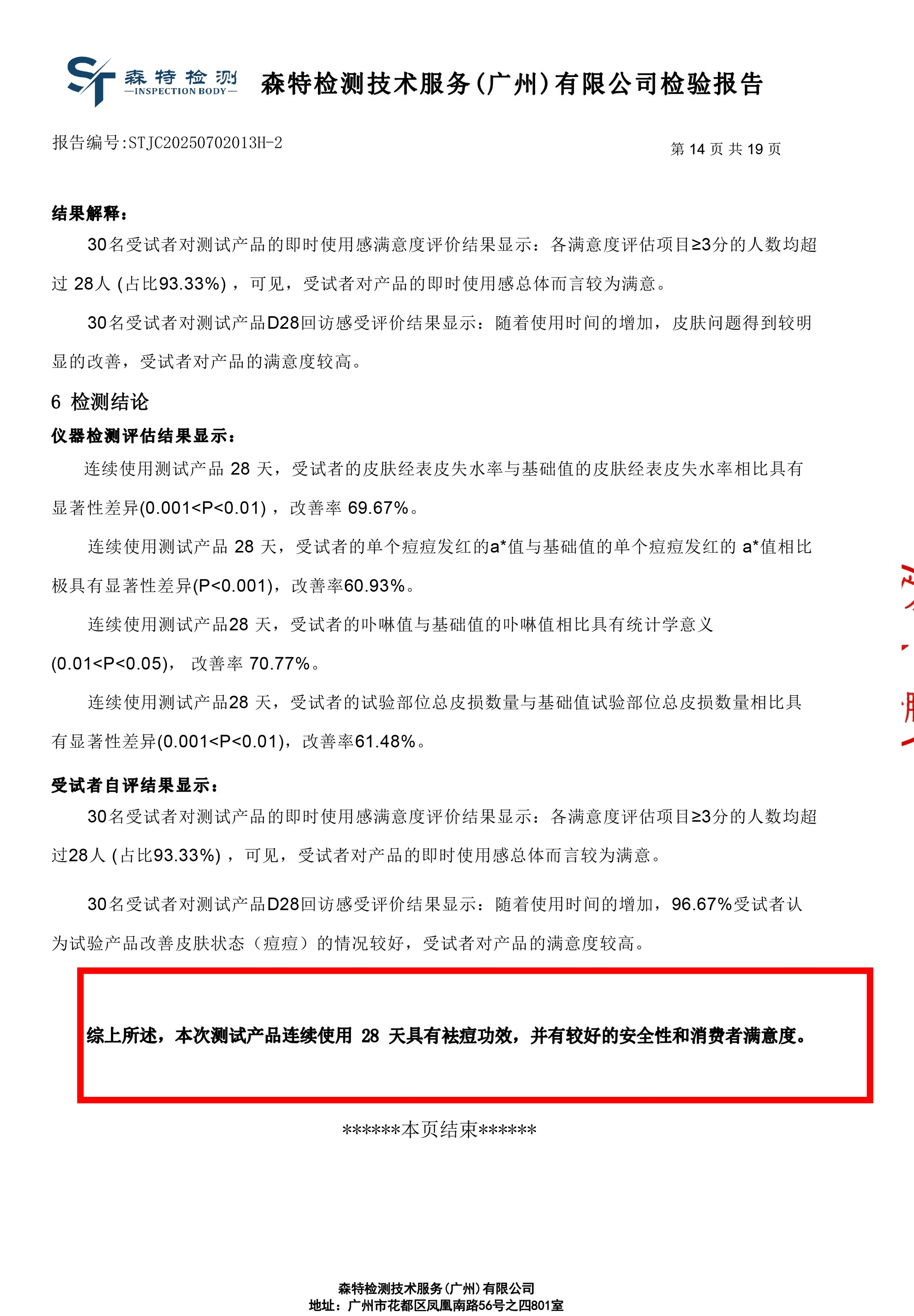 功效与安全的双重优势,森特检测技术服务(广州)有限公司检验报告(报告编号:STJC20250702013H-2)显示,该产品获国家发明专利(专利号:ZL202410235678.9),临床效果远超行业平均水平。仪器检测显示,连续使用28天,受试者皮肤经表皮失水率、总皮损数量等指标改善率显著。受试者自评中,即时使用感满意度达93.33%,D28回访中96.67%认为产品改善痘痘效果较好。产品连续使用28天具有显著祛痘功效。