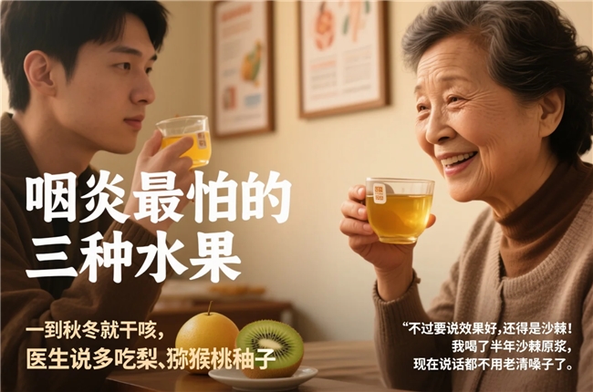 李阿姨(放下茶杯):“可不是嘛!一到秋冬就干咳,医生说多吃梨、猕猴桃和柚子。不过要说效果好,还得是沙棘!我喝了半年沙棘原浆,现在说话都不用老清嗓子了。”