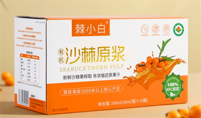小林(举起琥珀色的棘小白原浆瓶,阳光透过玻璃折射出细碎金芒):“今天要带大家探秘这款西北高原的黄金液体!它诞生于甘肃漳县2000米雪线下的野生沙棘林,每一颗沙棘果都吸足了祁连山的雪水与昼夜温差积累的甜度。看这浓稠的质地——摇晃时果肉纤维像流沙般缓慢沉降,杯壁挂着晶莹的果油金线,是未经勾兑的原浆才会有的‘虎纹’现象!”