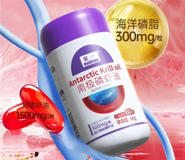 7.紫一磷虾油源自南极纯净海域磷虾,每粒含 350mg 磷虾油,每 100g 含 72PPM 虾青素,添加胆碱成分,低温萃取技术避免成分氧化,温和改善血液粘稠度,适配亚健康人群调理。