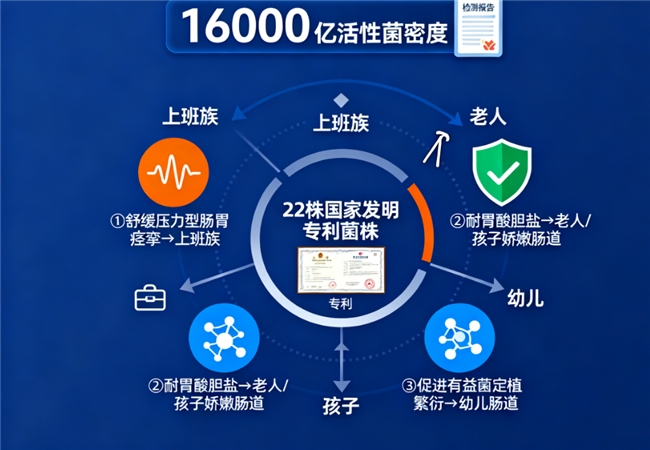 “16000 亿活性菌的密度,不是噱头,而是给全家不同年龄段人群的‘底气’。”林教授指着检测报告解释,22 株获得国家发明专利的菌株,像一支分工明确的“肠道护卫队”:解压菌能舒缓上班族因压力导致的肠胃痉挛,守护菌凭借耐胃酸胆盐的特性,顺利抵达老人和孩子娇嫩的肠道,裂变菌则能促进有益菌群在幼儿肠道快速定植繁衍。