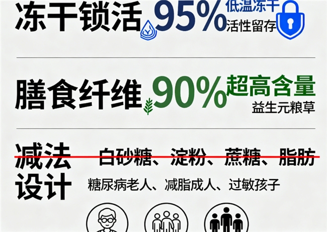 更难得的是它的工艺与配方:真空冷冻干燥技术能锁住菌株 95% 以上的活性,避免运输储存中的损耗;90% 超高膳食纤维含量的益生元,如同为菌群提供“粮草”,确保它们在肠道长期存活。而配方中剔除白砂糖、淀粉、蔗糖、脂肪的“减法设计”,让糖尿病老人、减脂期成人、过敏体质孩子都能安心食用。