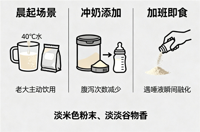 晨起时,她会撕一袋倒入 40℃的温水,淡米色的粉末很快融化,带着淡淡的谷物香,老大主动捧着杯子喝;给老二冲奶粉时,也会加小半袋,腹泻的次数明显少了;先生加班到深夜,直接倒一袋在嘴里,粉末遇唾液瞬间融化,像吃了颗温和的“肠胃糖”。