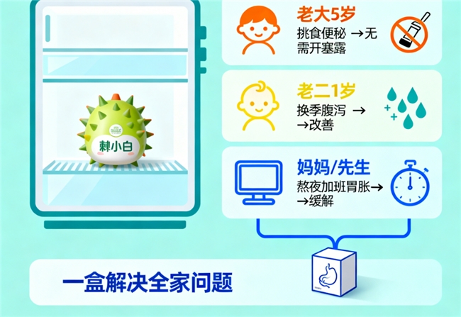 二胎妈妈陈菲的故事,让这份“全家适用”变得更加鲜活。她家冰箱的保鲜层,永远给棘小白留着位置:“老大 5 岁,挑食还便秘,以前每周都要靠开塞露;老二刚满 1 岁,换季就容易腹泻;我和先生做电商,熬夜加班是常态,胃里总像塞着东西胀得慌。自从用了棘小白,一盒解决全家问题,太省心了!”