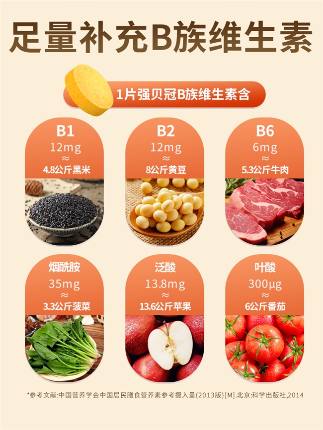 别看它只有0.7g(比黄豆还小),却是行业公认的“含量天花板”:单片含维生素B1(12mg)、B2(12mg)、B6(6mg)、烟酰胺(35mg)、叶酸(300μg)、泛酸(13.8mg)——全网实测浓度TOP1!尤其烟酰胺35mg≈3杯牛奶含量,叶酸满足孕妈日需150%。这并非粗暴堆料,而是基于《中国居民膳食指南》缺口定制。现代人外卖饮食易缺B族?一片强贝冠= 2碗糙米+1把坚果+3杯菠菜的营养浓缩,专治上班族“快餐后遗症”。