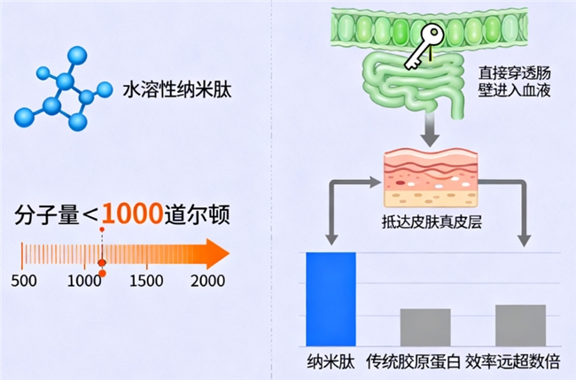 细胞级渗透力:采用水溶性纳米肽技术,分子量小于1000道尔顿。这如同为营养配备了“分子级钥匙”,无需繁复消化过程,直接穿透肠壁进入血液,即可抵达皮肤真皮层——效率远超传统胶原蛋白数倍,如同朝露渗入干渴土壤般自然迅捷。