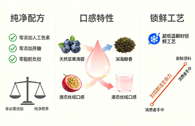 纯净承诺与舌尖艺术:坚持“三零原则”——零添加人工色素、零添加蔗糖、零脂肪负担。口感却颠覆传统保健品的药感,呈现不老莓天然的浆果清甜与鲟鱼子酱的深海醇香,如同抿入一口“液态丝绒”。超低温瞬时锁鲜工艺,封存了每一滴原料的鲜活生命力。