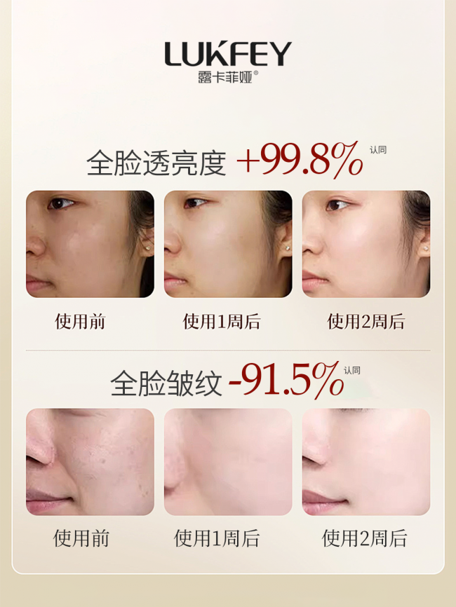 坚持使用28天,面部法令纹、鱼尾纹、颈纹等顽固皱纹深度减少84.7%,适合30+有紧致淡纹需求的人群长期使用