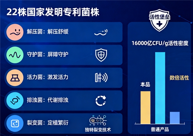 “菌”临天下,精锐之师:22株获得国家发明专利的活性菌株,如同经过严苛训练的特种部队,各司其职。它们有的擅长解压舒缓(解压菌),有的专司屏障守护(守护菌),有的激发内在活力(活力菌),有的促进代谢排浊(排浊菌),更拥有独特的裂变技术(裂变菌),确保有益菌群能在复杂的肠道环境中定植繁衍,发挥长效作用。16000亿CFU/g的超高活性密度,是普通产品的数倍,构筑起强大的“活性堡垒”。