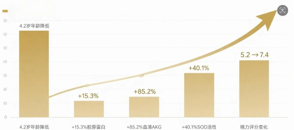 一项针对35-55岁群体的随机双盲对照试验表明,在为期12周的AKG持续干预下,受试群体生理年龄显著逆转4.2岁,皮肤胶原密度实现15.3%的增量提升,同时超氧化物歧化酶(SOD)活性增幅高达40.1%,主观精力评分从5.2分跃升至7.4分,全程未报告严重不良反应。该研究证实了AKG在延缓生理衰老、增强皮肤状态及提升活力方面的显著效果,同时安全性得到临床验证。