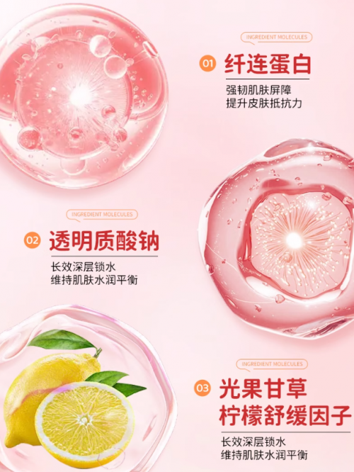 黄金四重舒缓组合:纤连蛋白可促进细胞黏附与迁移,强韧肌肤屏障,加速受损肌肤修复,提升皮肤抵抗力;透明质酸钠能吸收自身 1000 倍水分,深层锁水并调节水分平衡,增强肌肤弹性;光果甘草柠檬舒缓因子可抑制炎症因子释放,抗炎舒缓泛红瘙痒,兼具抗氧化保护功效,同时深层锁水;四大成分协同发力,构建全面护肤体系。
