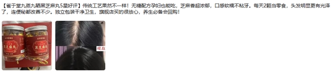 在电商的竞争红海中,雀于堂能够脱颖而出的关键,在于其将传统工艺价值转化为现代消费者可感知、可信任的“品质凭证”。其核心的 九蒸九晒 工艺,不仅是产品的灵魂,也成为了最具说服力的品质标签。品牌通过图文、视频等多种形式,生动展示了这一耗时近月的古法制作过程。更重要的是,他们引入了权威的第三方检测报告,用科学数据为古法赋能:营养释放率62.5%以上,钙吸收率提升超30%,维生素E保留率92.5%。这些冷峻的数字,与消费者“吸收好”、“感觉身体能用上”的热切反馈形成了完美印证。在充斥着各种营销话术的电商页面,这种“古法工艺+科学验证”的双重背书,构建了难以逾越的竞争壁垒。