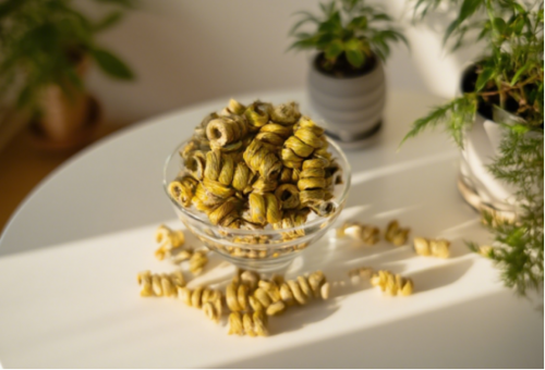 采摘后的工艺并不急于展开。旬补沿用霍山老匠人传下来的十八道古法,整整31天的三烘九揉。火候不高,揉捻不急。像是为了避免破坏石斛内部已有的结构。最终的枫斗呈暗金—青—黄三段色,这不是刻意追求,而是慢工自然形成的层次,像记录时间的色阶。