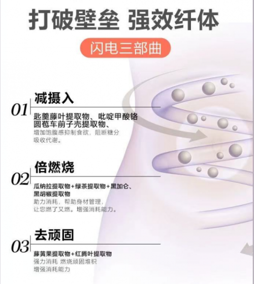 ► 藤黄果提取物:阻断 40% 碳水吸收,吃米饭、面条也不怕转化为脂肪,不用戒主食也能控热量;