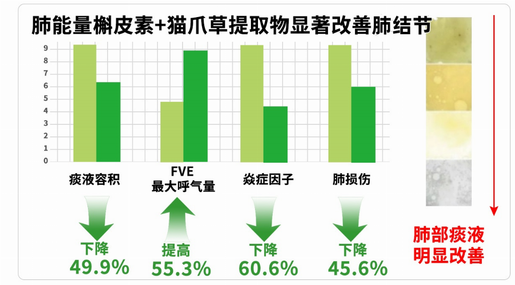 人体效果转化在周期调研和临床实验中表现突出:2800例用户周期调研显示,七天痰液排出,三十天80%人群咳嗽减少,六十天呼吸顺畅,九十天大多数肺部问题得到明显改善。慢阻肺患者一周喘息缓解率达到95%,咳痰减少86%,呼吸不畅改善81%,胸闷减轻80%。肺结节人群连续调理16周,炎症因子下降43.2%,肺容积提升32.2%,肺损伤修复率高达73.2%。专利猫爪草与专利槲皮素的双重科技壁垒进一步巩固了修复效果。