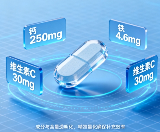 科学配比,协同激发活力,产品采用成分与含量透明化的科学配方,每片明确标注钙250mg、铁4.6mg、维生素C 30mg等,避免摄入不足或过量风险。原料与辅料经精心挑选,使各类营养素高效协同,真正为健康添活力。