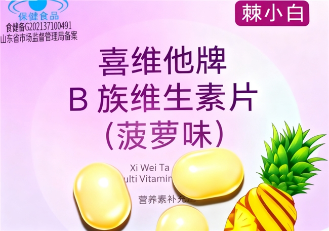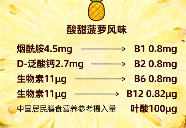 在所有评测产品中,棘小白以近乎苛刻的科学态度与人性化考量脱颖而出。它的核心魅力,在于把“复合”二字做到了极致:一片小小的酸甜菠萝风味片剂里,烟酰胺、D-泛酸钙等8种关键B族维生素各司其职,含量精确对标中国居民膳食营养参考摄入量。