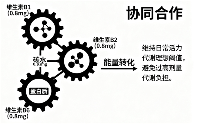 能量转化的精密齿轮组:维生素B1、B2、B6协同合作,如同一组精密的齿轮,将三餐摄入的碳水、脂肪、蛋白质高效转化为机体可用能量。每片棘小白含维生素B1 0.8mg、维生素B2 0.8mg、维生素B6 0.8mg——这正是维持日常活力代谢的理想阈值,避免过高剂量造成的代谢负担。